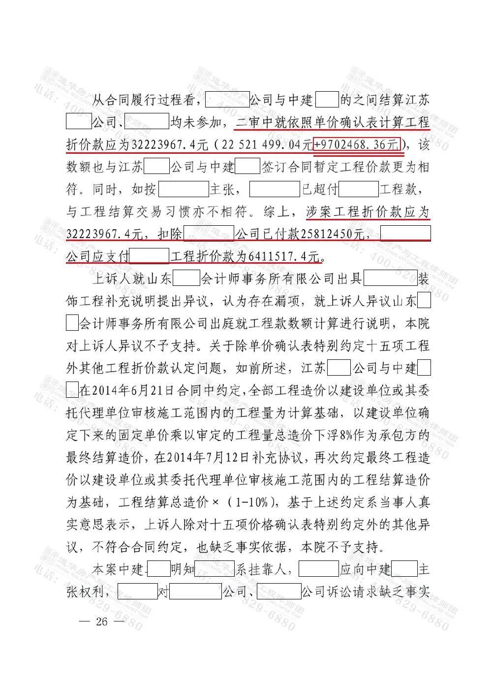 最终,二审法院--山东省青岛市中级人民法院采纳了道华律师的观点,重新委托了第三方审计单位,就《报价单》中所涵盖的项目,以报价单所确定的单价,乘以科技公司审定的工程量,认定在一审判决的基础上,额外增加了970多万元结算款,扣减了原先认定超额支付的330余万元,中建公司仍欠付姜某款项640余万元。