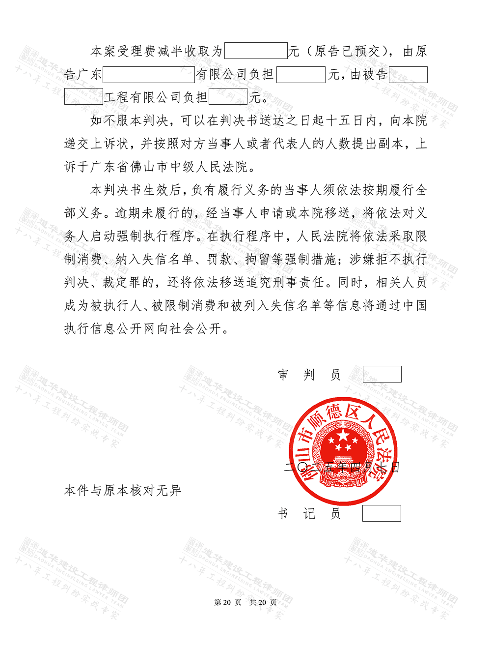 经审理,法院充分采纳广东道华建设工程律师团的代理意见,作出如下裁判: