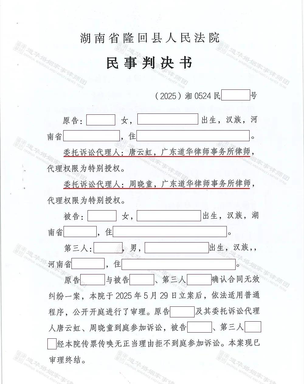 道华成功案例| 赠与合同无效纠纷:丈夫婚内赠第三者百万财产,广东道华律师事务所唐云虹律师助力原配追回117万元及利息!2025-11-11